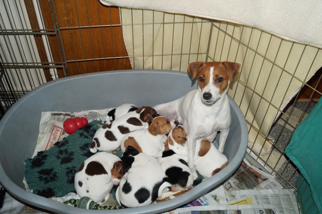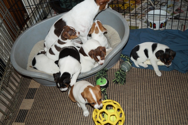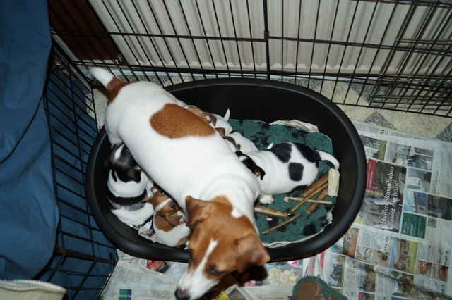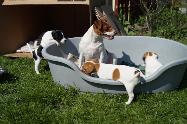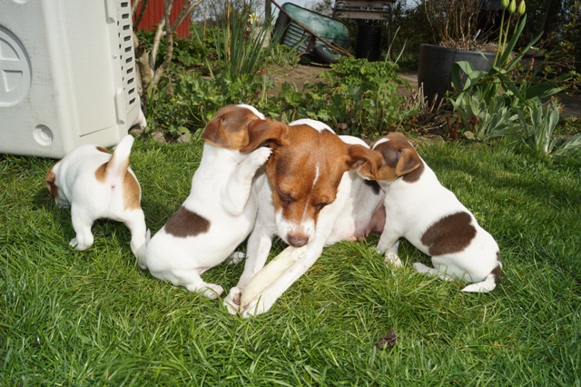 Både Fay og Sussi er begyndt at sove i min seng hele natten, og vi kan se at de er begyndt at "sige fra" når hvalpene vil die. De er stadig afhængig af deres mors mælk, men mødrene er igang med at vænne dem til at spise mere selv, og få mindre mælk. Et levn fra urhunden, som flere gårdhunde har bevaret i deres instinktive adfærd er, at overspise af hvalpefoderet, samle hvalpeflokken om sig, og gylpe mad op til dem. Hvalpene kaster sig over det. Man kan synes det er ulækkert, men det er jo en del af naturens forunderlige måde at være skruet sammen på. Det er smart nok, for det hjælper jo til med afvænningen fra mors mælk.