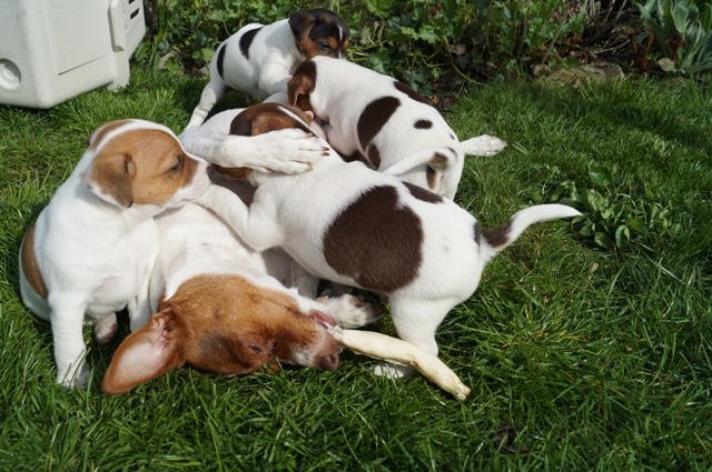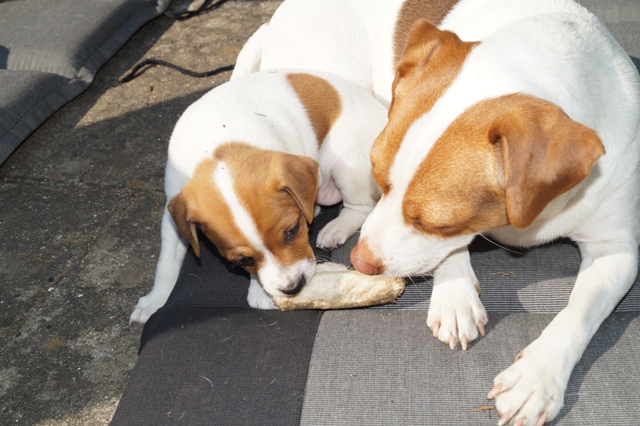 Hvalpenes tænder er nu så langt fremme, og kæberne så stærke, at de sagtens kan tygge tørfoderkugler. De synes det er meget spændende, og det knaser så sjovt. De får stadig en blanding af de tørre kugler, og opblødt hvalpefoder med youghurt i.
