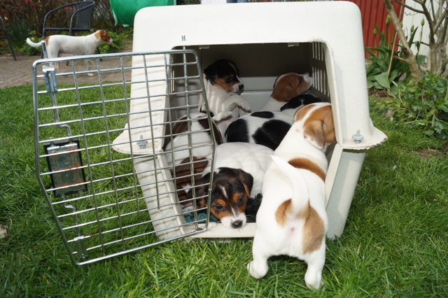 Hvalpene søger selv tilbage i transportkassen, når de er trætte, de anser den hurtigt for et trygt og godt sted