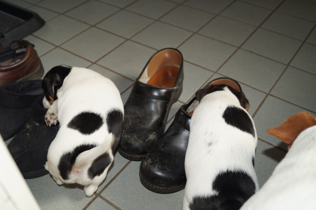 Inden længe finder hvalpene selv vej fra haven og tilbage igennem gangen til køkkenet...og der lærer de så helt af sig selv lidt om skoene - ups!