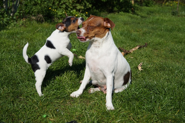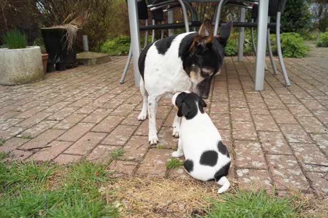 Hvalpene lærer at respektere de ældre hunde, her er det Jazmine der helt fornuftigt sidder stille og ærbødigt og lader Kikka snuse til sig