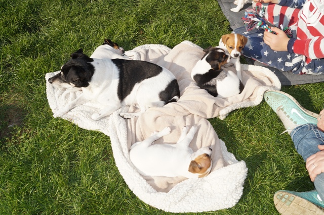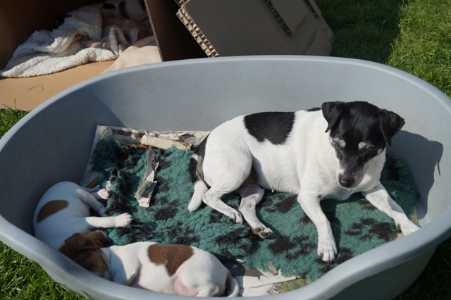 Oldemor/tipoldemor Maddy er ikke helt vild med hvalpene, men har egentlig ikke noget imod at være sammen med dem, når de bare ligger stille