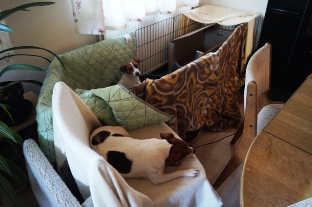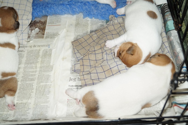 Da sommeren skruer yderligere op for temperaturerne sidst på ugen, må papkassen skiftes ud med et noget luftigere bur. På halvdelen af bunden er der tæppe, på den anden halvdel aviser, sådan at hvalpene selv kan vælge, hvor de føler sig bedst tilpas. Det meste af tiden ligger de på aviserne. På den allervarmeste dag får de et par gamle, våde, opvredne viskestykker ind, og det er tydeligt at de indimellem søger hen til dem for at blive kølet lidt ned.