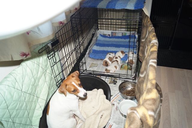 I denne uge har Fay og hvalpe derfor været igennem hele 3 forskellige kasser, plus en flytning, som skete helt tidligt på ugen. Første sal blev for varmt, så Fay fik en krog i stuen, hvor der er noget køligere. Fødekassen blev for lille og tæt, så der fulgte en ny og større kasse med ved flytningen.