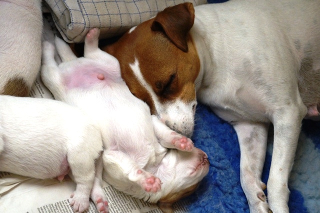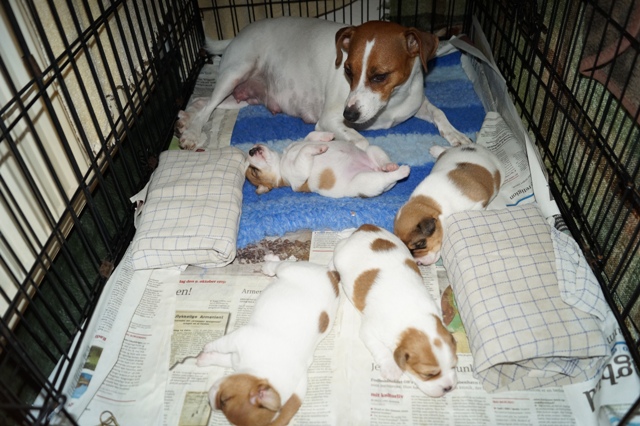 Alligevel er der ingen tvivl om, at hun sætter hvalpenes behov over sine egne, nu hvor det hele bliver presset lidt ekstra af varmen. Hun lægger sig ind til dem tit, så de kan drikke, og hun holder dem rene og fine. Og derefter må hun lægge sig ud i kassen ved siden af buret, for at give dem luft og plads. Hun er som en ekstra varmedunk i buret, og selvom hun helst ville blive derinde ved hvalpene, flytter hun sig ud, for at de skal kunne finde hvile og ro.