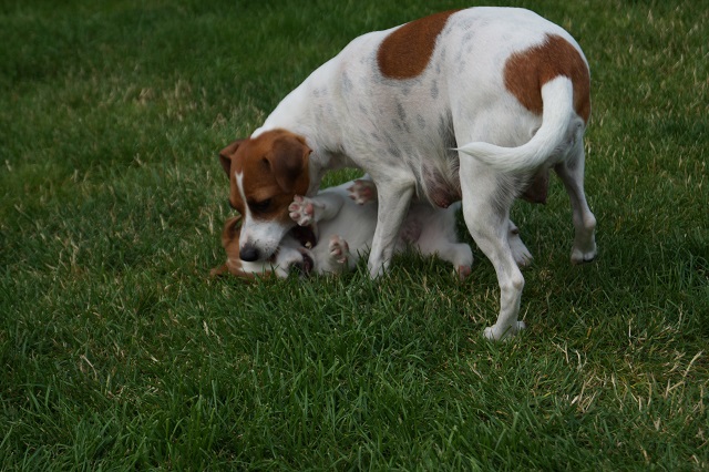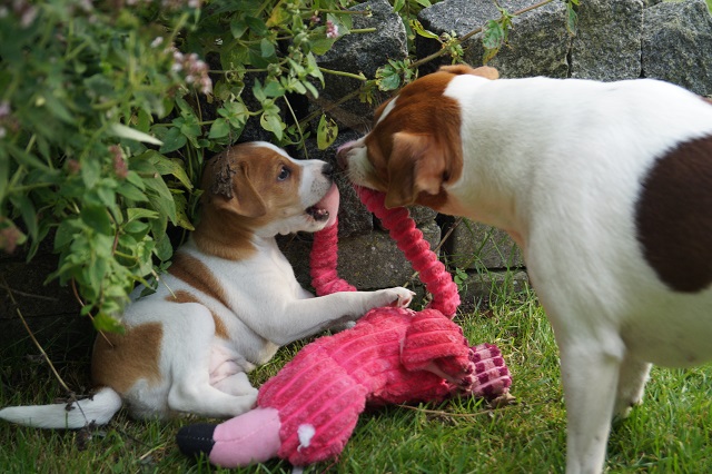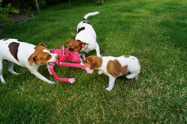 Og som i alle hundeflokke (og ulveflokke) afløses mor af den yngste tæve i flokken indimellem. I dette tilfælde Ida, som selv kun er 16 mdr. gammel. Her findes andre regler og vilkår for leg, end med mor, da elastiken ikke er helt så lang, og konsenvens er i højere grad tilstede, end hos mor. Også igennem denne leg med Ida, lærer hvalpene vigtige ting om livet.