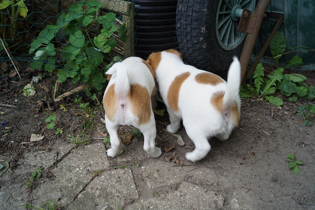 Det første, der sker om morgenen, er at de kommer en tur udenfor i haven. I løbet af natten har de tisset på aviserne i løbegården, men selvom Fay nu ikke længere "gør rent" efter dem, så er det kun engang imellem, at de også har skidt i løbegården. Indtil videre, er de - for alderen - det mest renlige kuld, vi har haft. Men vejret, og dermed mulighederne for at komme udenfor, har også rigtigt meget at sige i den forbindelse.