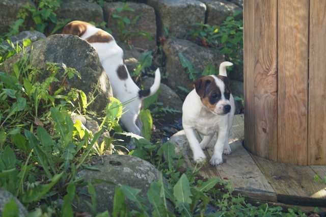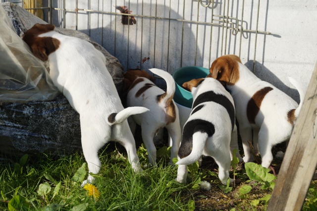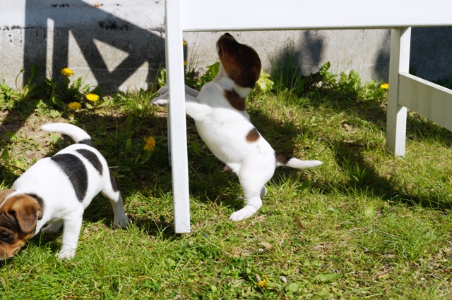 I starten af ugen vælter den første af hvalpene lidt ubehjælpeligt udover kanten ved døren til løbegården. Fra det øjeblik er løbet kørt, den har lært at komme ud, og vil ikke andet fra nu...indenfor samme døgn, følger resten trop, og der kommer et brædt på, så "forhindringen" forhøjes...