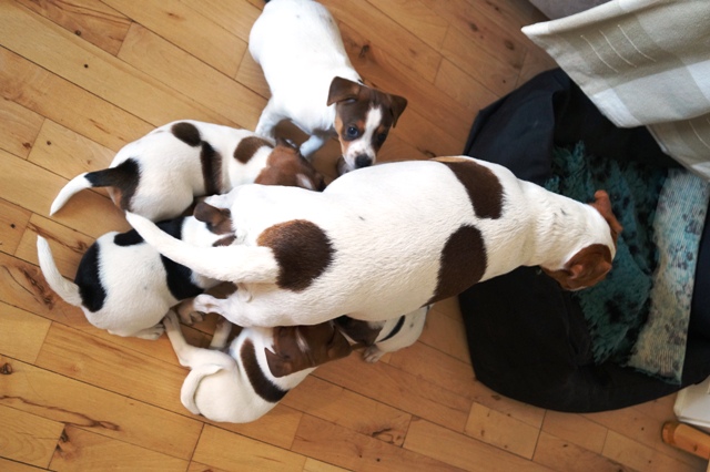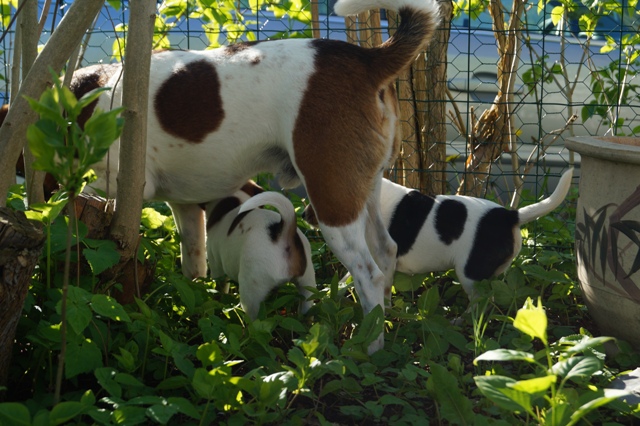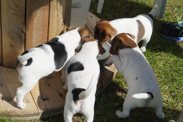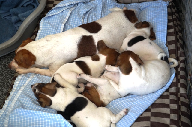 Nikki er stadig meget hos hvalpene, og de får også mælk hos hende flere gange om dagen. Men de spiser mere og mere, og vi ser Nikki oftere "sige fra" når de er for voldsomme, eller når det bare ikke passer hende at give dem mad. Hun holder af at ligge hos dem, og være sammen med dem, og hun er sød til at lege med dem. Det er tydeligt at hun synes det er hyggeligt at være hundemor, og hun er også virkelig god til det!