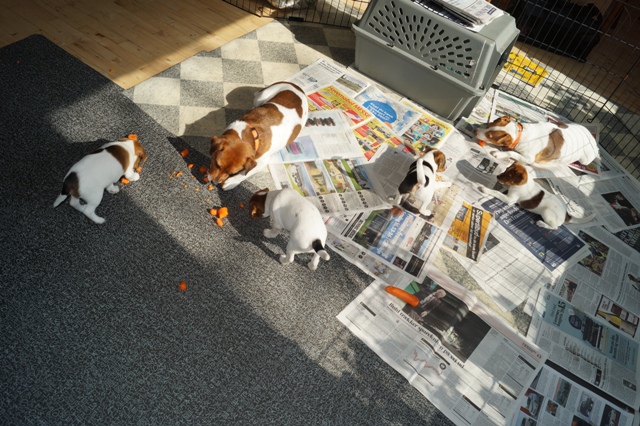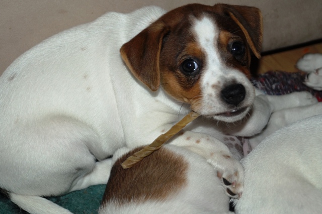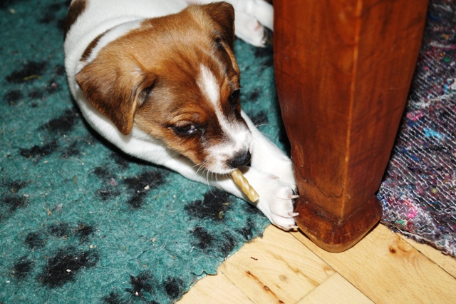 På hjemmefronten kræves der uendelige mængder af tyggeting, og repetoiret er nu udvidet med både rå gulerødder og råt okseben. Begge dele er stor succes!