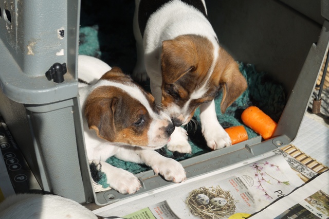 I bilen lægger de sig nu hurtigt til at sove i transportkassen, som de allerede er helt trygge ved at være i. En sådan kasse kan være til meget stor nytte i deres videre træning, og det er en hjælp at de som helt små føler sig godt tilpas og trygge ved at være i sådan en.