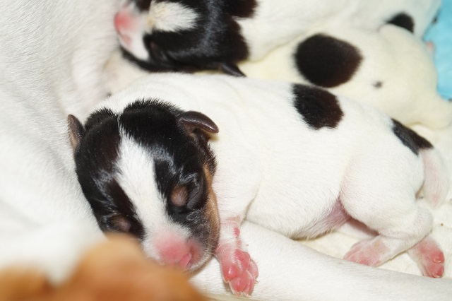 Det blev til 3 hanner og 1 tæve. To af hannerne er stumphalede, ligesom deres far, den ene kort stump, den anden lidt længere. De er allesammen trefarvede.