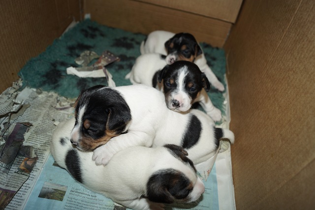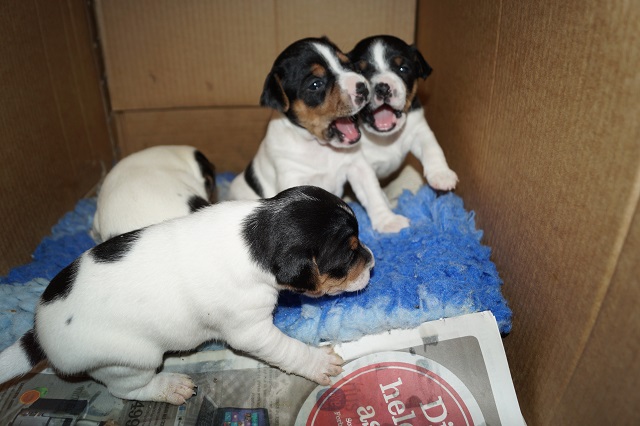 Sidst på ugen kan man tydeligt se, at de pludselig begynder at kunne opfatte lyde. De reagerer pludseligt og voldsomt på at en voksen hund gør. De kan endnu ikke afgøre hvor lyde kommer fra, så de reagerer instinktivt ved at trykke sig ned hvor de er, eller trække ind i et hjørne af kassen, indtil de vænner sig til de mest almindelige lyde omkring dem. Så klogt den er indrettet, naturen!