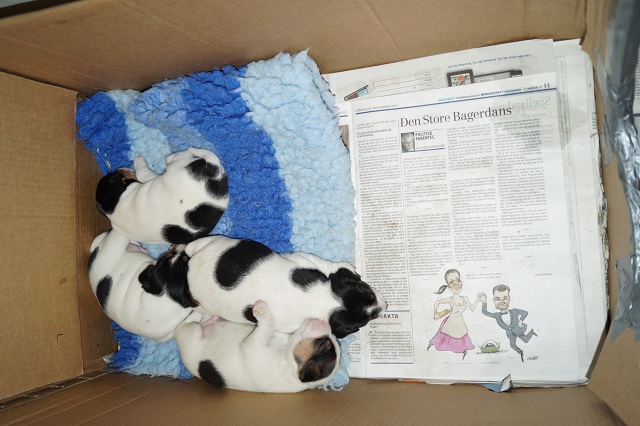 Instinktivt tisser en hvalp ikke hvor den sover. Den vågner, og bevæger sig automatisk væk fra hvor den lå, og tisser. Vi udnytter denne viden, og sørger for at hvalpenes kasse nu har to forskellige slags underlag. Der hvor de sover i den ene ende, og aviser i den anden ende.