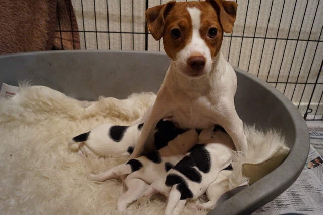 Alligevel er kassen pinligt ren, hvalpene fine og rene, og de vokser og vokser. Så hun passer dem perfekt, hun må snige sig op til dem i ubemærkede øjeblikke.