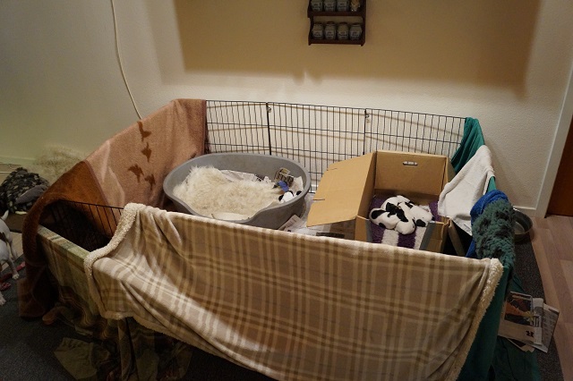 Derfor indrettes hvalpenes løbegård nu i køkkenet, og en flytning finder sted. Først fuldt ud afskærmet fra omgivelserne med tæpper over kanterne. Ida falder hurtig til ro med den nye plads, og synes vist at det er meget hyggeligt, at hun kan holde øje med både hvalpe, køkken og stue samtidig.