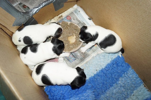 Flere gange i løbet af ugen forsøger vi at tilbyde hvalpene lidt opblødt hvalpefoder. De viser overhovedet ingen interesse - et tydeligt tegn på, at de ikke mangler noget, og at Ida er kommet os i forkøbet.