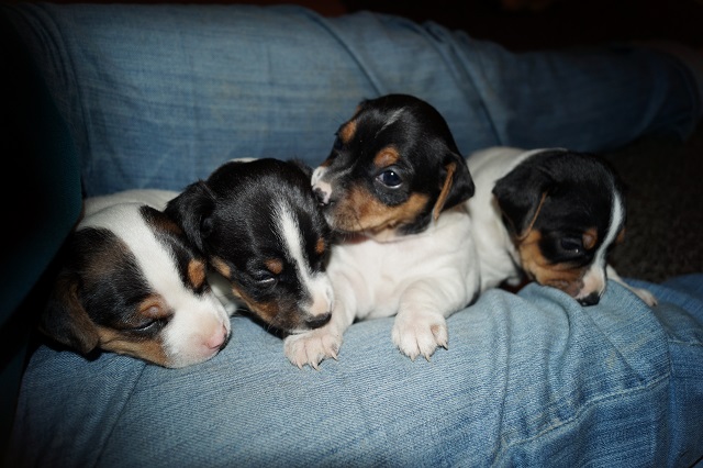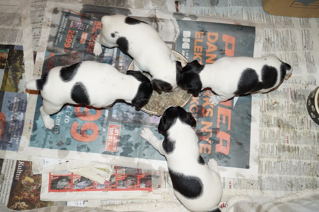 I uge 4 bliver gruppen af små pletter ligesom til rigtige hunde. De begynder pludselig selv at kunne komme ud af kassen, og foretager rent faktisk en flytning til den store åbne hundekasse med "lammeskindet" ved siden af. Den er blødere, og ikke mindst nemmere at komme tilbage i, når de vil sove.