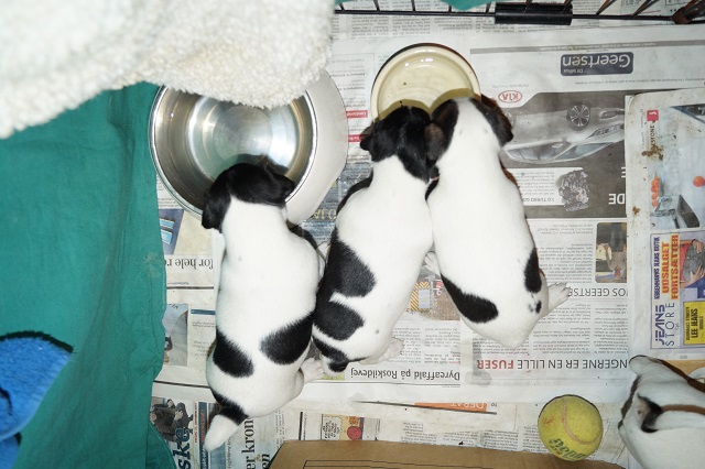Efter de valgte at flytte, sker der noget nyt. Samtidig med at de bliver gode til både at komme ud og tilbage ind i kassen igen, begynder de at forlade kassen helt, når de "skal". Derfor har de tæppe/kunstigt lammeskind i hele kassen nu, kun enkelte gange er der én der ikke har kunnet holde sig. Så skifter vi sengetøj, men det sker ikke hver dag, og pludselig sker det slet ikke mere. Hvalpene besørger nu kun på aviser ude i løbegården.