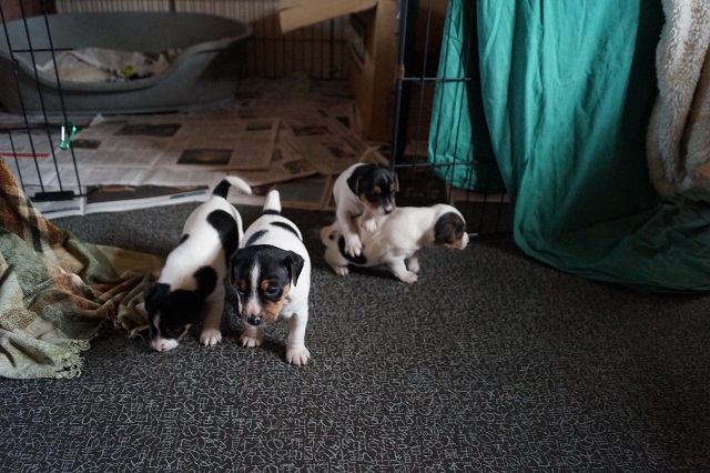 Hvalpene bevæger sig bedre og hurtigere, de øver vendinger, skinangreb på hinanden, og de kan også pludselig både knurre og gø spontant. Benene er stadig usikre, men de har bedre og bedre styr på dem.