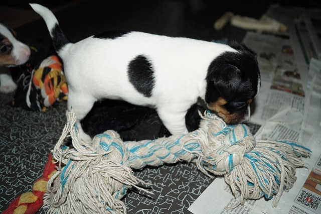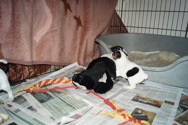 Hvalpene har adgang til store knudereb, små tygge hudben og nogle gamle suppeben. Men det er ikke spændende nok, til at holde på opmærksomheden fra en hvalp, der er nysgerrig, har fart på, og hele tiden vil se og prøve, og ikke mindst smage på noget mere.