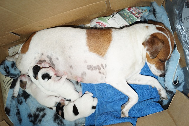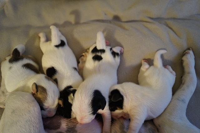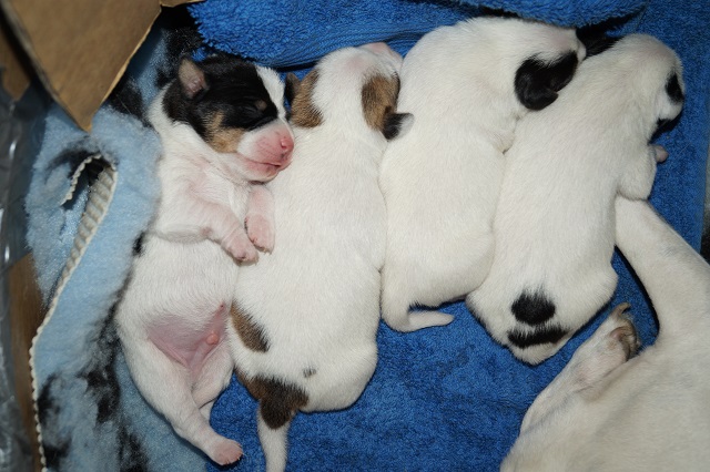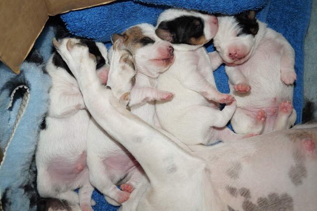 Det, der er interessant ved dette er to ting. Det ene er, at man så kunne tro, at hvalpene ikke fik nok varme, eller nok mad, men der er fuldstændigt ro i kassen hos dem, og de er vokset til over dobbelt størrelse på den første uge, så der er ingen tvivl om, at de intet har manglet.