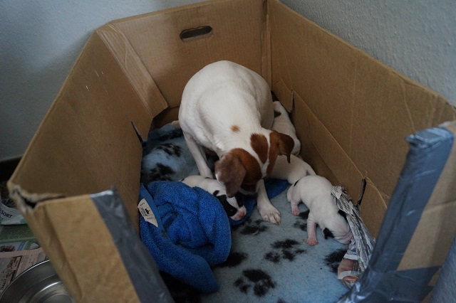 Det betyder, at når Vicki i den første uge render ind under vores senge i både soverværelse og kontor, og ind bagved sofaen og skraber og rumsterer rundt, bygger rede og lægger sig, ja så får hun lov til at gøre det i fred. Inden længe går hun alligevel tilbage til hvalpekassen af sig selv, hvor hun ofte skraber og roder noget rundt også, så man sommetider ikke kan se hvalpene for avisstumper, og rod i tæpperne.