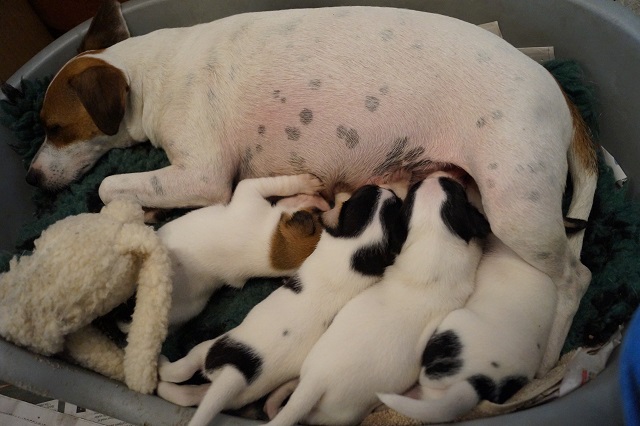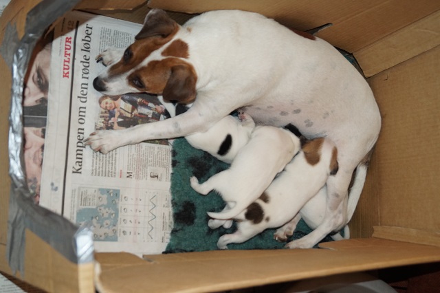 Hun lagde sig med det samme hos hvalpene, og flyttede sig næsten ikke derfra i det første døgn.