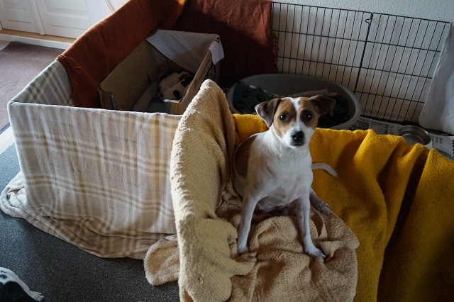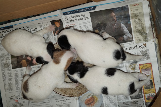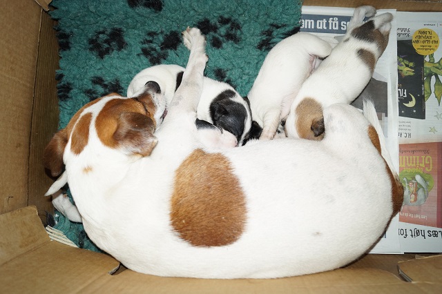 I den kommende uge, vil der i takt med at Vicki tillader det, blive lettet lidt på tæpperne, så de andre hunde kan kigge ind, og hvalpene kan kigge ud til dem ikke mindst.