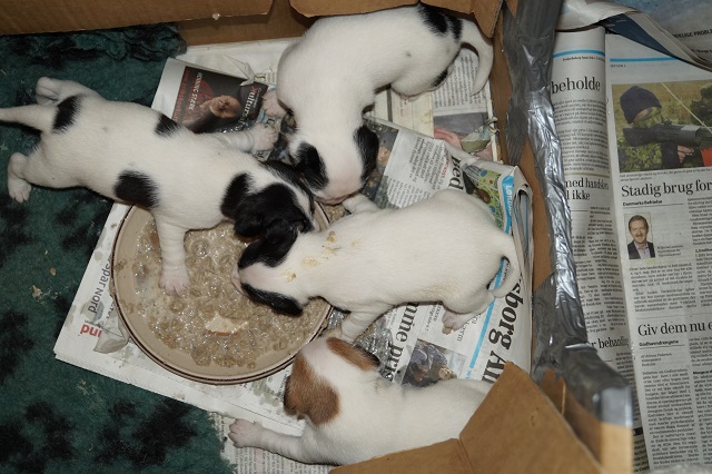 Det bliver derfor aktuelt at prøve på at introducere lidt "hvalpevælling" for første gang. Ofte går der mange dage, op til over en uge, fra man starter med det første "rigtige" måltid, til hvalpene egentlig lærer at labbe det i sig. Men ikke disse 4 knægte...lige fra starten viser de, at de udemærket ved hvad der skal ske med mad - det skal ned i maven, så de guffer i sig, uanset motorikken iøvrigt i resten af kroppen ikke helt følger med, ender de allesammen med at være sølet fuldstændigt ind. Men den ordner mor Vicki - "hvalpeslikkepind" er dejligt synes hun, og snart er de fine og rene igen, og får sig en tår "slukefter" hos mor.