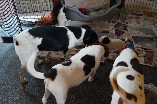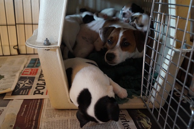 Straks ved begyndelsen af ugen falder det pludseligt naturligt, både for mor Vicki og hvalpene og resten af hundene, at løbegården åbnes, så hvalpene kan slutte sig til husets hundeflok.