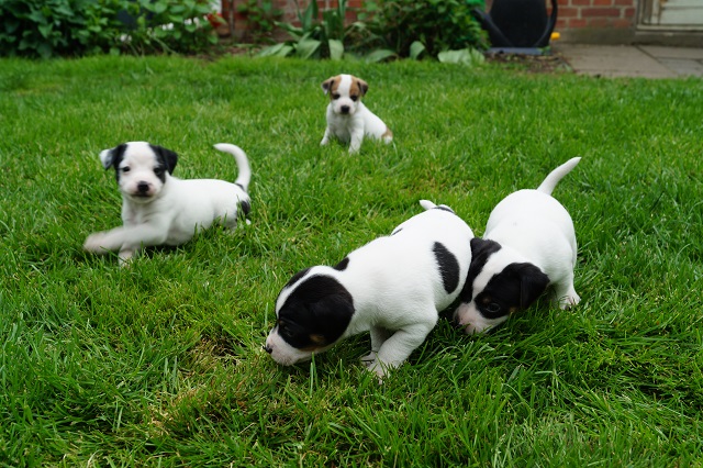 Heldigvis kommer der præcis nu godt vejr, og derfor kan hvalpene sagtens komme udenfor på korte besøg i haven. Da de stadig sover en del og iøvrigt trættes af alle de nye oplevelser og indtryk, er de kun ude kortvarigt i begyndelsen af ugen, og de bæres ud fra løbegården til haven i en transportkasse, og tilbage igen når de skal sove, for de kan endnu ikke selv finde vej så langt.