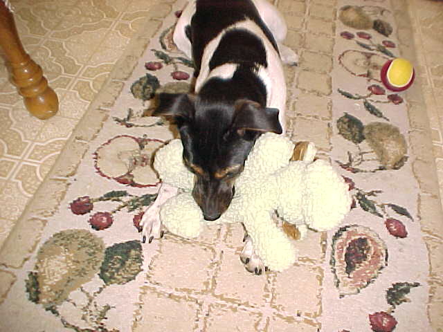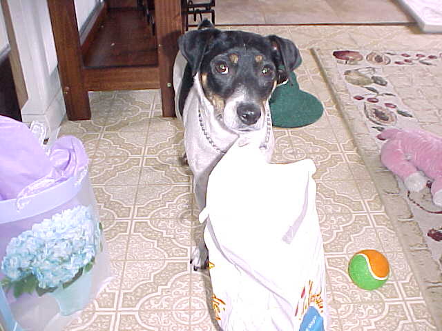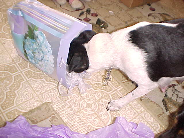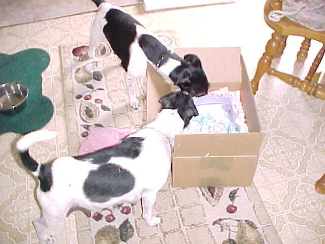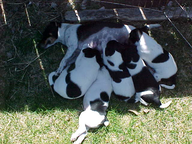 Maddy is showing signs of wanting to play with the puppies, if she could just keep them from "latching on" for milk. In many cases they are starting to know that they might as well not even try. This is obviously a relief to Maddy; she has started to "let loose" and become her good old playful self.